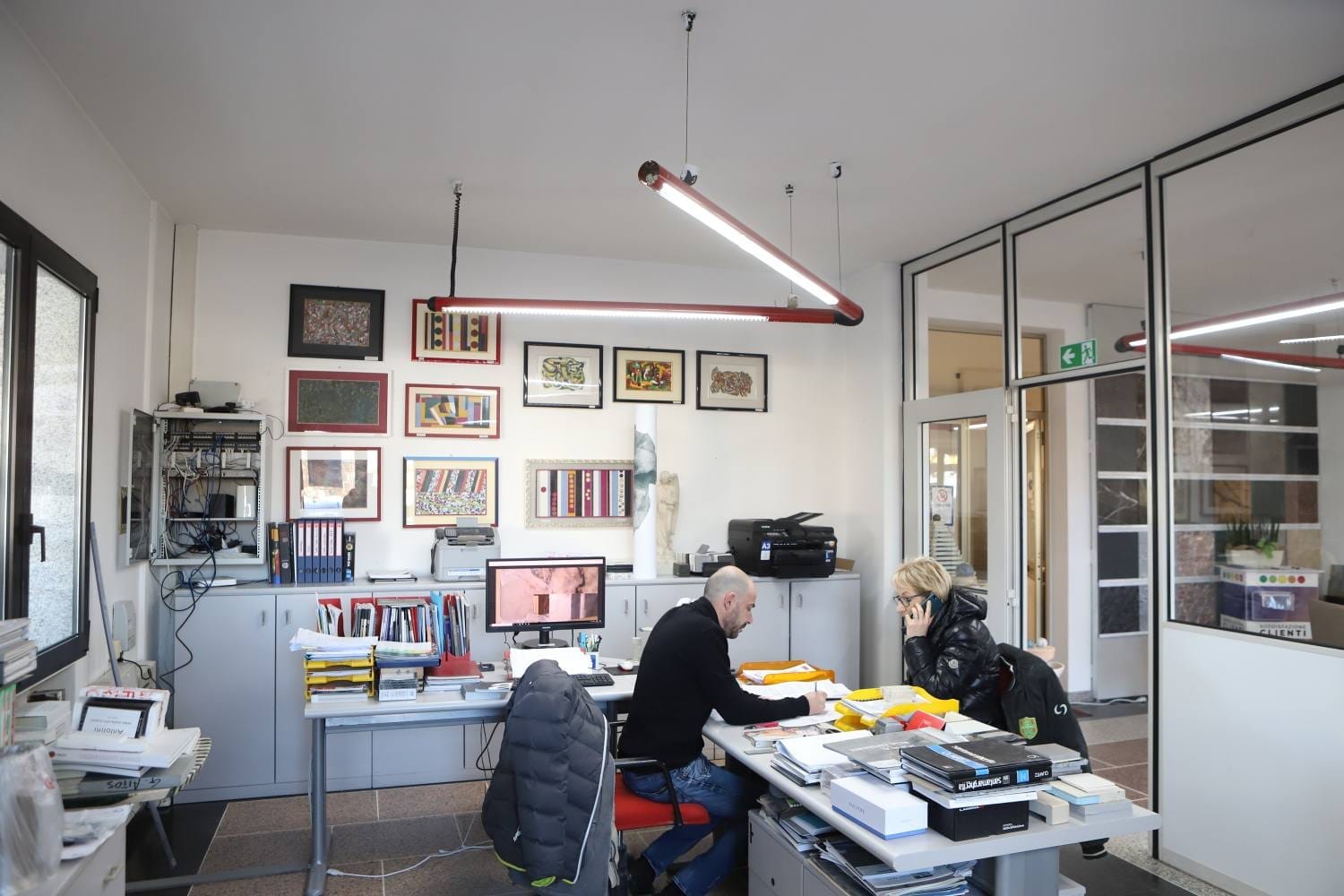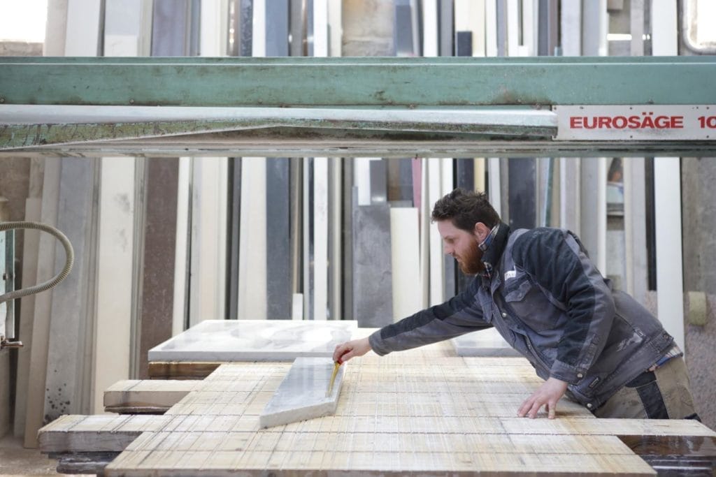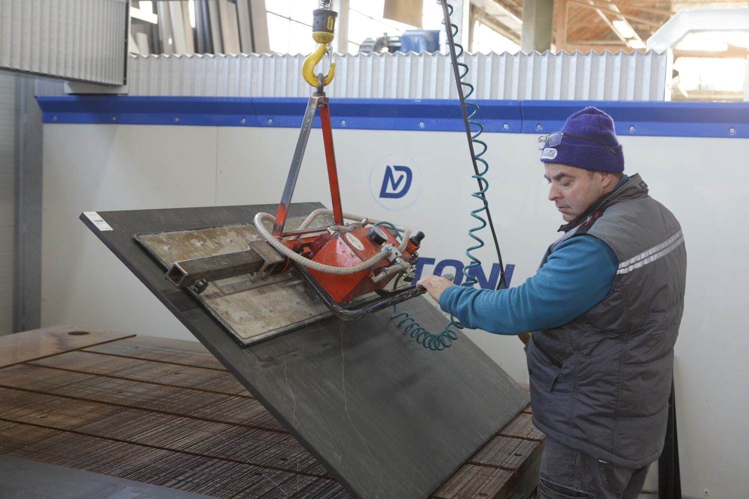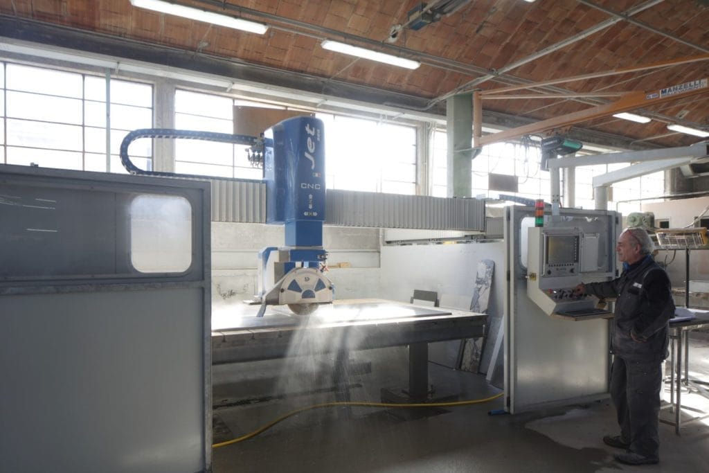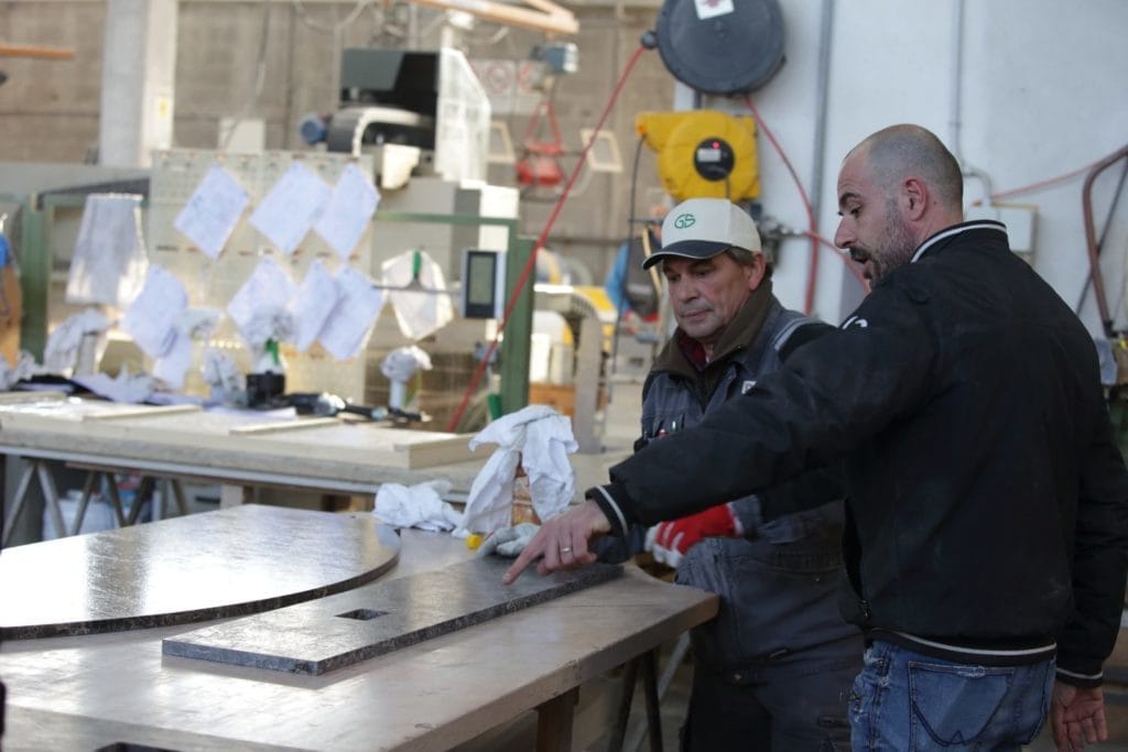 Una volta ultimata tale fase, il disegno tecnico viene consegnato all’operatore di fresatura, cioè l’addetto al taglio del manufatto. In questo settore per noi operano Renato e Mauro, i quali una volta studiato il disegno e individuato il materiale in magazzino, prima di prelevare una lastra controllano, ed è il primo controllo di qualità, che la stessa non abbia imperfezioni sia di carattere cromatico che ti carattere strutturale.