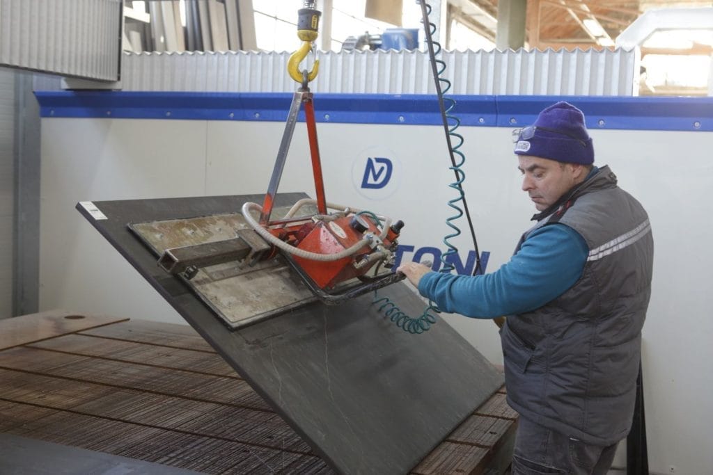 Una volta certi, e questo avviene al di fuori del capannone di produzione, che il materiale sia idoneo alla formazione del Top, tramite apposito carro ponte e successivo carello porta lastre, si inserisce la lastra all’interno della produzione.
