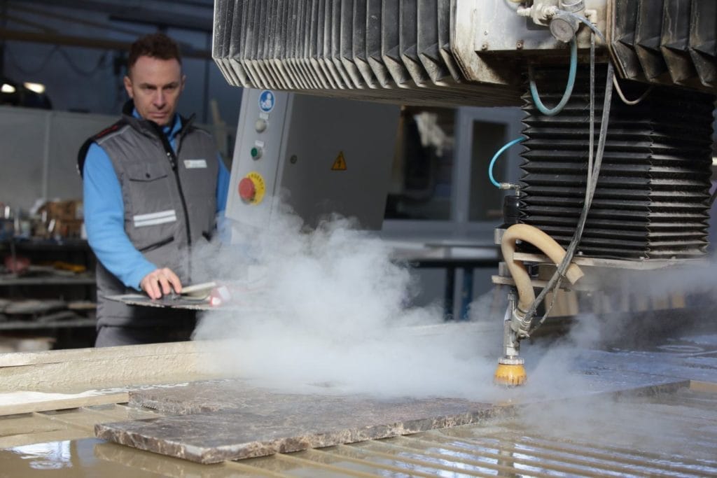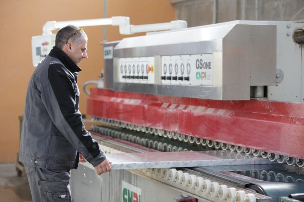 Finito questa prima attività il Top ancora grezzo si sposa in un altro reparto, dando il via alla seconda fase, esattamente nelle postazioni di Luciano, il quale con l’utilizzo delle macchine denominate lucida coste, esegue le finiture dei bordi perimetrali del manufatto.