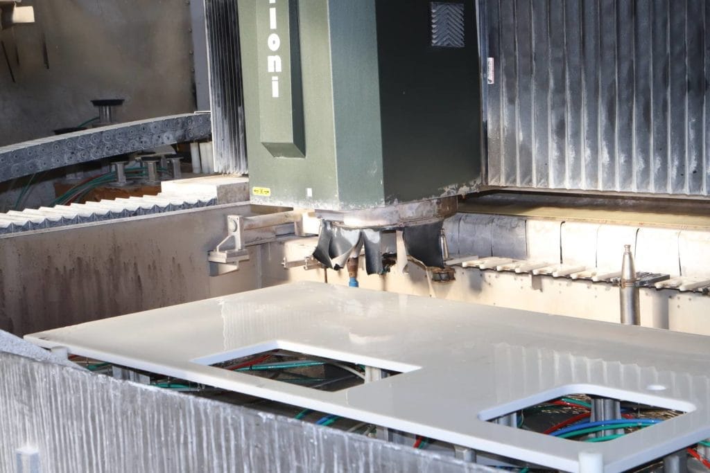 La quarta fase è aleatoria. Esiste un ulteriore stazione di produzione, non obbligatoria però, ci riferiamo all’eventuale utilizzo della contornatrice, gestita dal nostro Guglielmo. In questa stazione il manufatto si ferma e subisce una lavorazione, in caso il manufatto sia costituito da lavelli filo Top o sotto top integrati. Questa macchina sempre a controllo numerico, ha il compito di predisporre delle scanalature/i delle rimozione parziale di materia prima in modo da garantire la complanarità delle superficie dopo aver posato il lavello composto da altro materiale, oppure piano cottura.