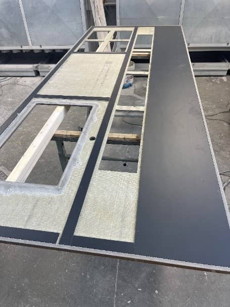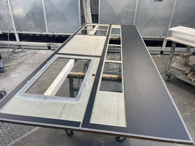Spesso però queste compensazioni si possono vedere e, in alcuni casi (sbalzi, snack, altro), toccare (ad esempio, se mi abbasso e guardo il sotto del piano). Per rendere le superfici ben rifinite e belle da vedere, abbiamo ingegnerizzato un pannello, costituito da materiale alleggerito ma molto solido, atto a sopportare il peso del piano sulle basi, senza aumentare il carico del manufatto, grazie allo strato in poliuretano.
